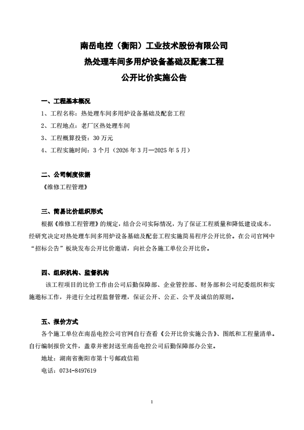 热处理车间多用炉设备基础及配套工程公开比价实施公告