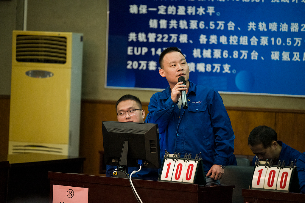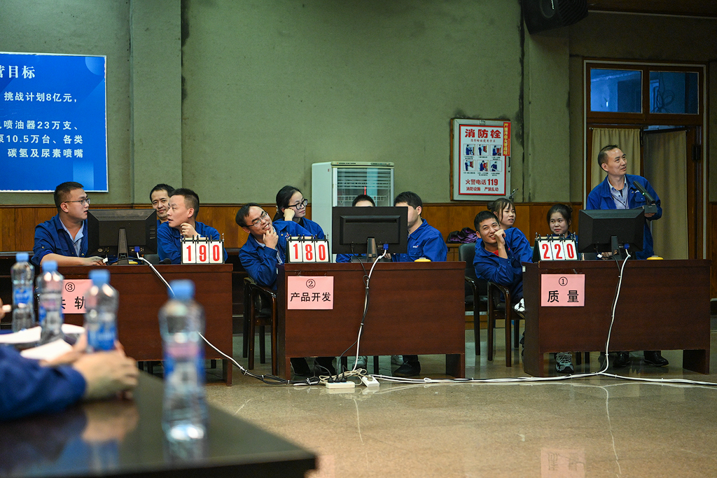 大赛由公司副总经理李运升担任裁判长,总师办主任伍立英、内控审计部部长贺志勇、质量控制部刘月林担任裁判。比赛分预赛和决赛两个阶段进行。预赛共3场,16支代表队抽签决定上场顺序,每场预赛前2名出线直接进入决赛;决赛1场,由6支参赛队比拼并决出一、二、三名。竞赛题型包含必答题、抢答题和风险题三个环节。在10月12日、13日晚的预赛中,16支参赛队严谨审题、认真作答,赛出了风格,赛出了水平,充分展示了扎实的质量管理流程基础知识功底和融洽的团队协作精神,比赛紧张激烈,比分交替上升,赢得了观众和评委热烈的掌声。经过3场预赛的激烈比拼,产品开发部、共轨车间、热处理车间、总装车间、机关一支部、质量控制部6支代表队脱颖而出杀入决赛。