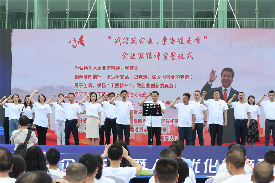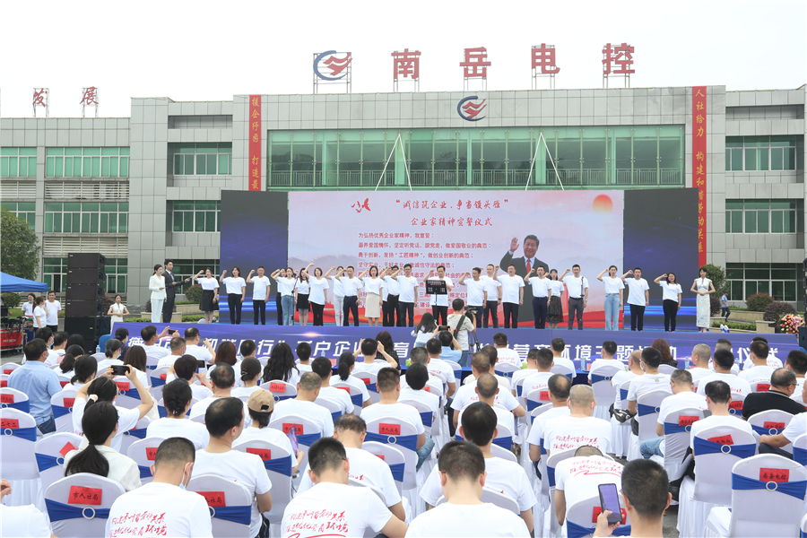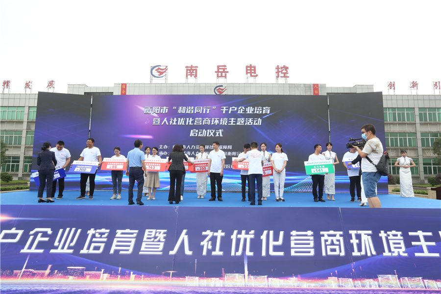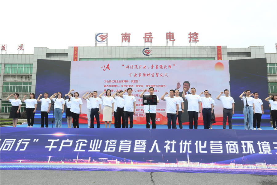 启动仪式现场举行了“和谐同行,千户企业培育在行动”主题宣传、“我的衡阳、我的奋斗、我的前景”主题宣传、“政企同心、共克时艰”主题宣传、“青春作伴好还乡”主题宣传四大主题宣传活动。在“和谐同行,千户企业培育在行动”主题宣传活动中,举行了“诚信筑企业,争当领头雁”企业家精神宣誓仪式,由公司党委书记、董事长龙美彪领誓,他带领23位企业家代表高举右拳,立下了“涵养爱国情怀,坚定听党话、跟党走,做爱国敬业的典范……”的铮铮誓言。在“我的衡阳、我的奋斗、我的前景”主题宣传活动中,现场人员共同观看了“奋斗中的衡阳青年人才”短视频,南华大学与南岳电控合作引进博士、南华大学特聘教授、博士生导师刘俊,现场分享了自己“大雁”南飞及回乡奋斗的动人故事。在“青春作伴好还乡”主题宣传活动最后环节,省、市人社部门领导现场为南岳电控等10家企业送上稳岗返还、就业见习补贴、创业担保贷款政策“大礼包”。