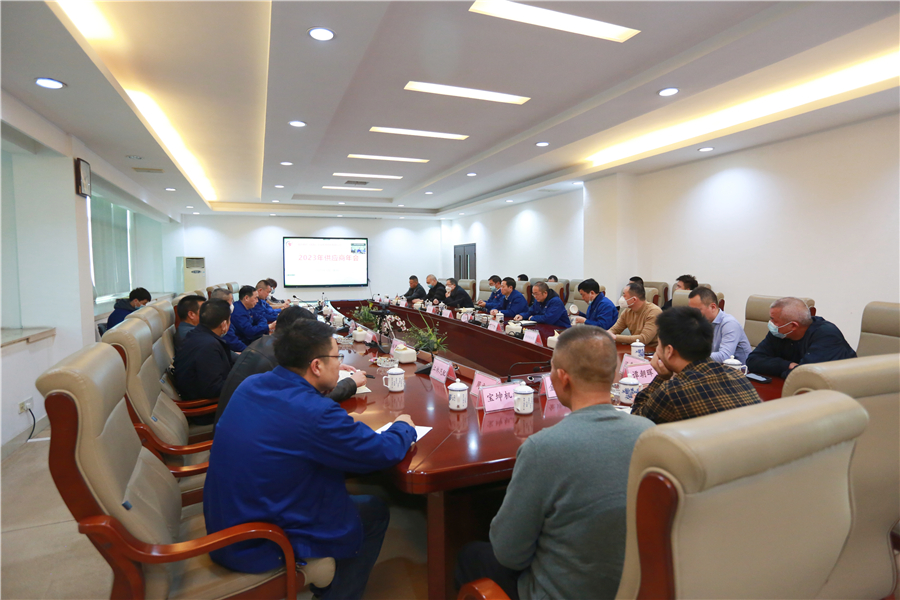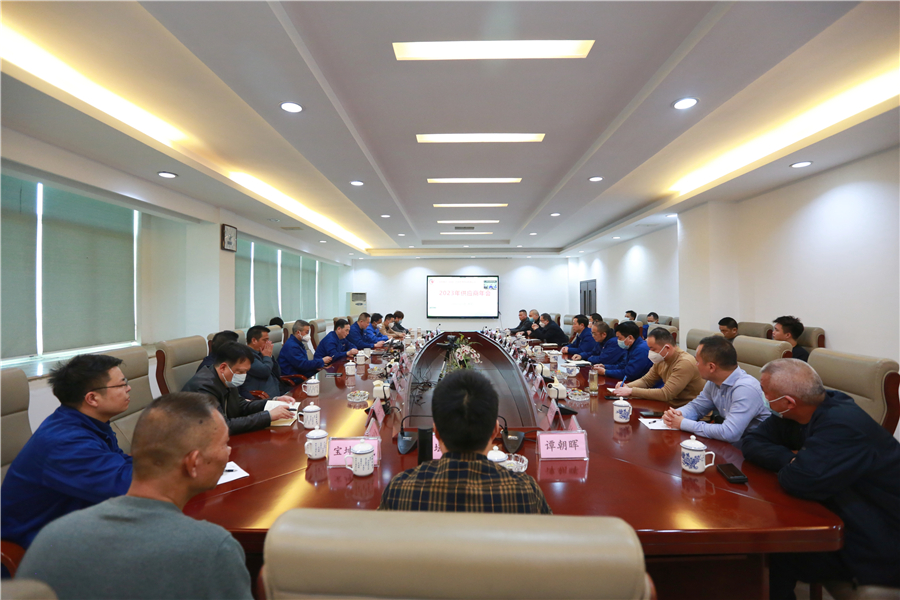 2023年1月13日,公司2023年度供应商年会在新厂VIP会议室隆重召开。本次供应商年会采取现场+云视频的形式举行,主会场现场邀请15家“2022年度优胜供应商”代表参会,来自全国各地的100余名供应商代表通过视频连线方式参加会议。公司党委书记、董事长龙美彪,党委副书记、总经理谭新民,常务副总谭爱平等高层领导及技术中心、质量控制部、采购中心等部门负责人出席会议。