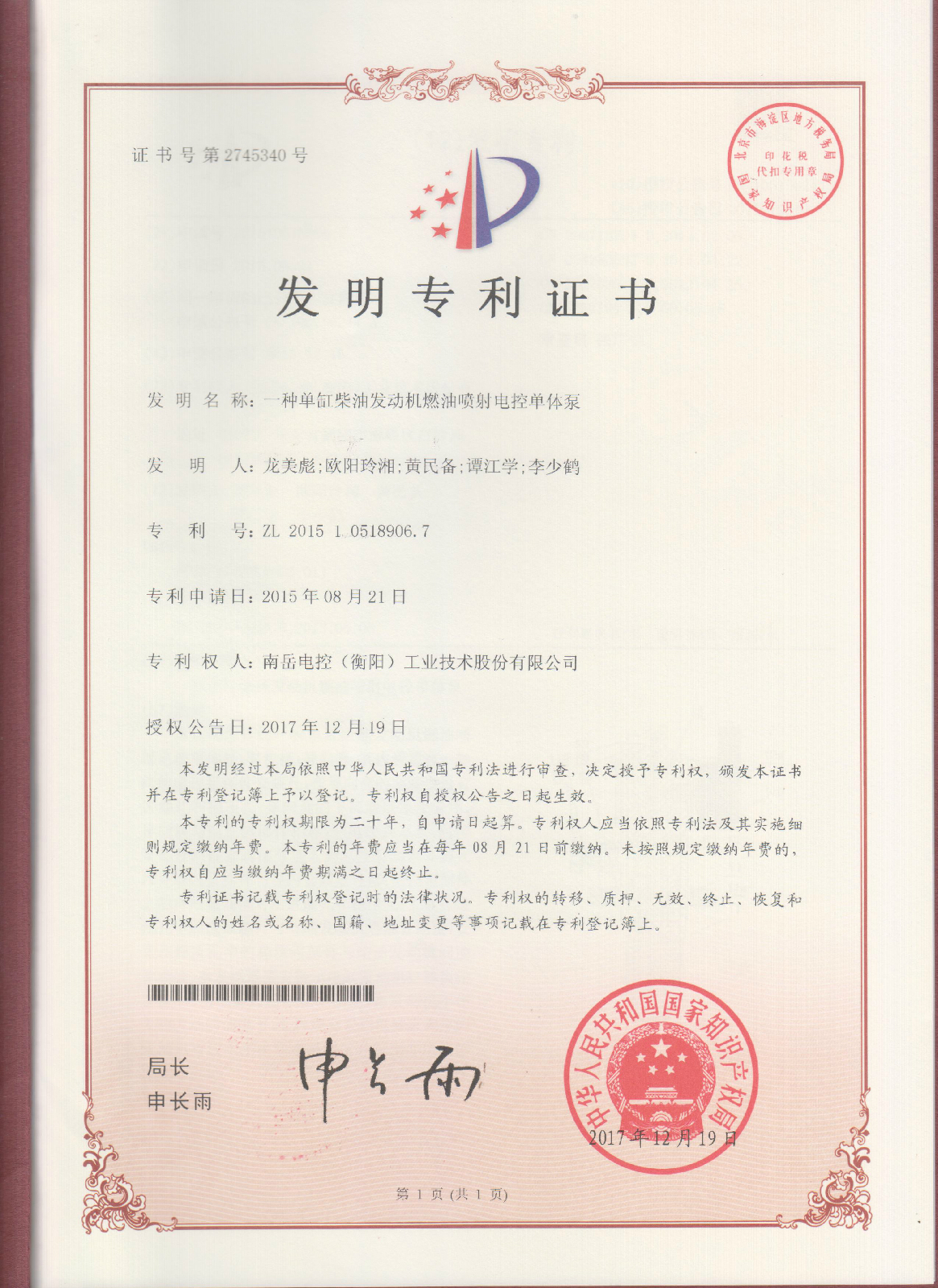 2015105189067 一种单缸柴油发动机燃油喷射电控单体泵