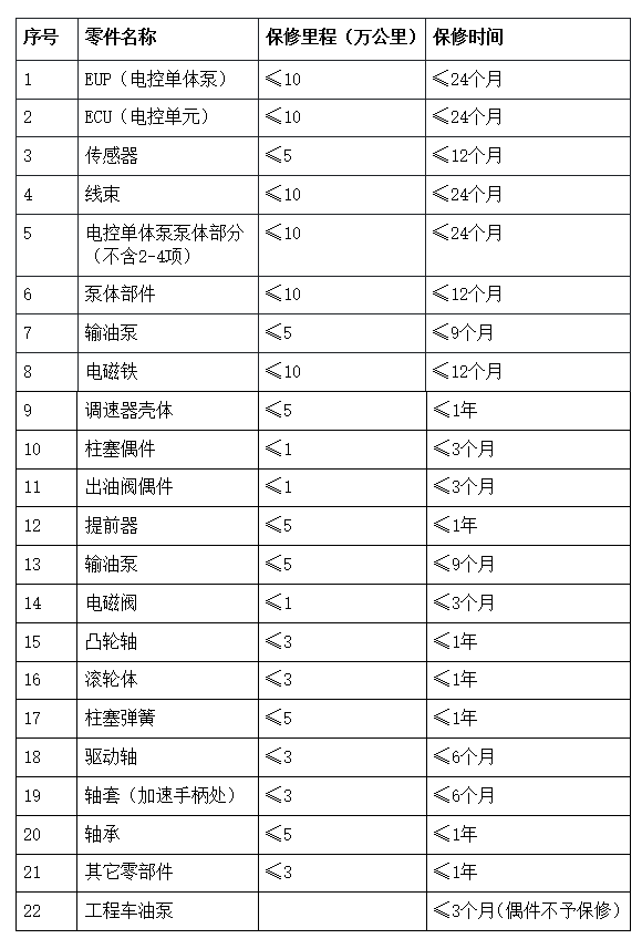3.保修时,不论更换任何零部件和喷油泵总成,保修期限均从原里程、原时间上进行累计,并不重新进行计算;